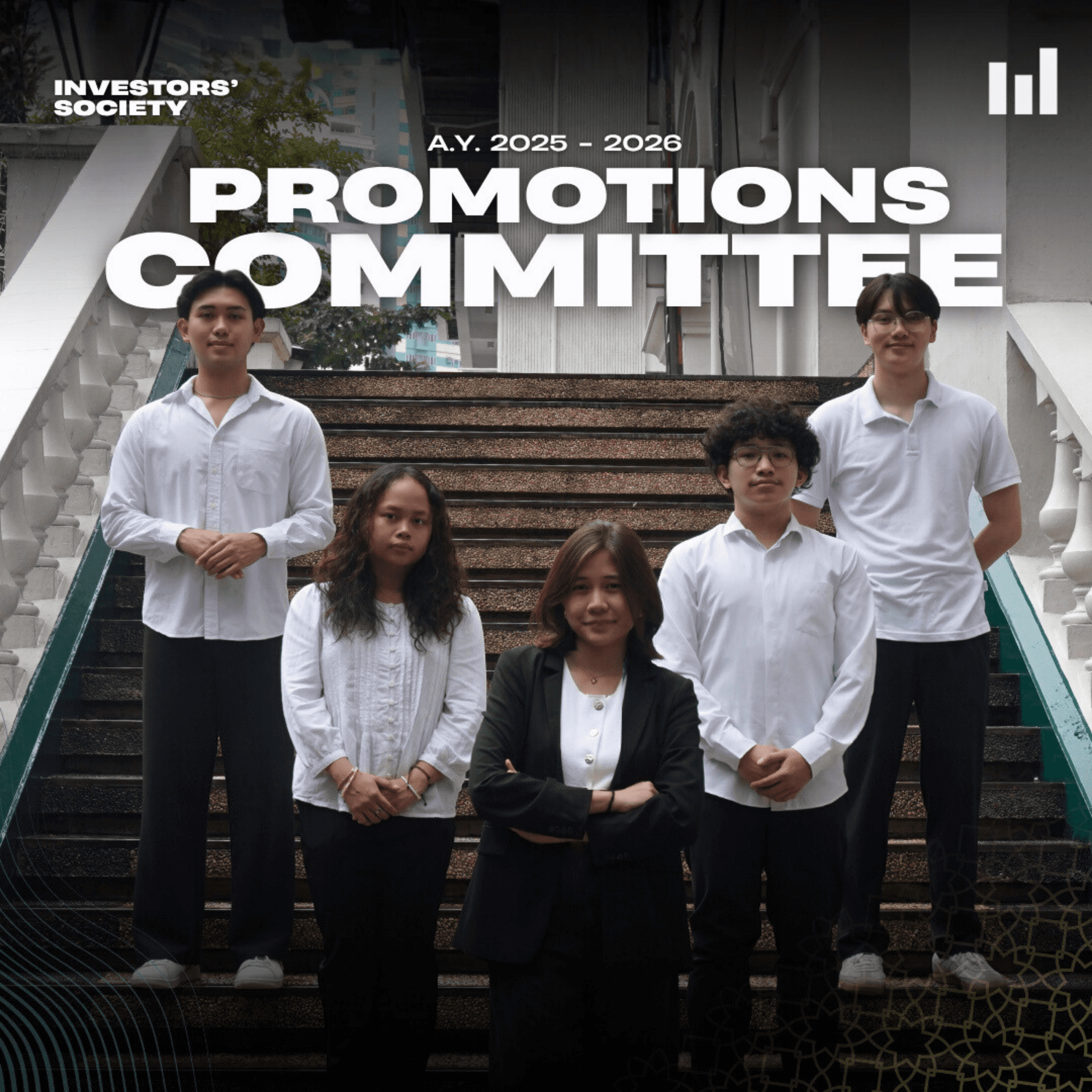 The Promotions Committee is responsible for publicizing Investors’ Society’s events to external entities by systematically processing events and coordinating promotional campaigns. Furthermore, this committee heads outreaches toward marginalized communities and manages financial literacy workshops through termly socio-civic events. The ultmate objectives of this committee includes enhancing the organization’s visibility, fostering long-term relationships with stakeholders, as well as amplifying levels of financial literacy among Filipinos.